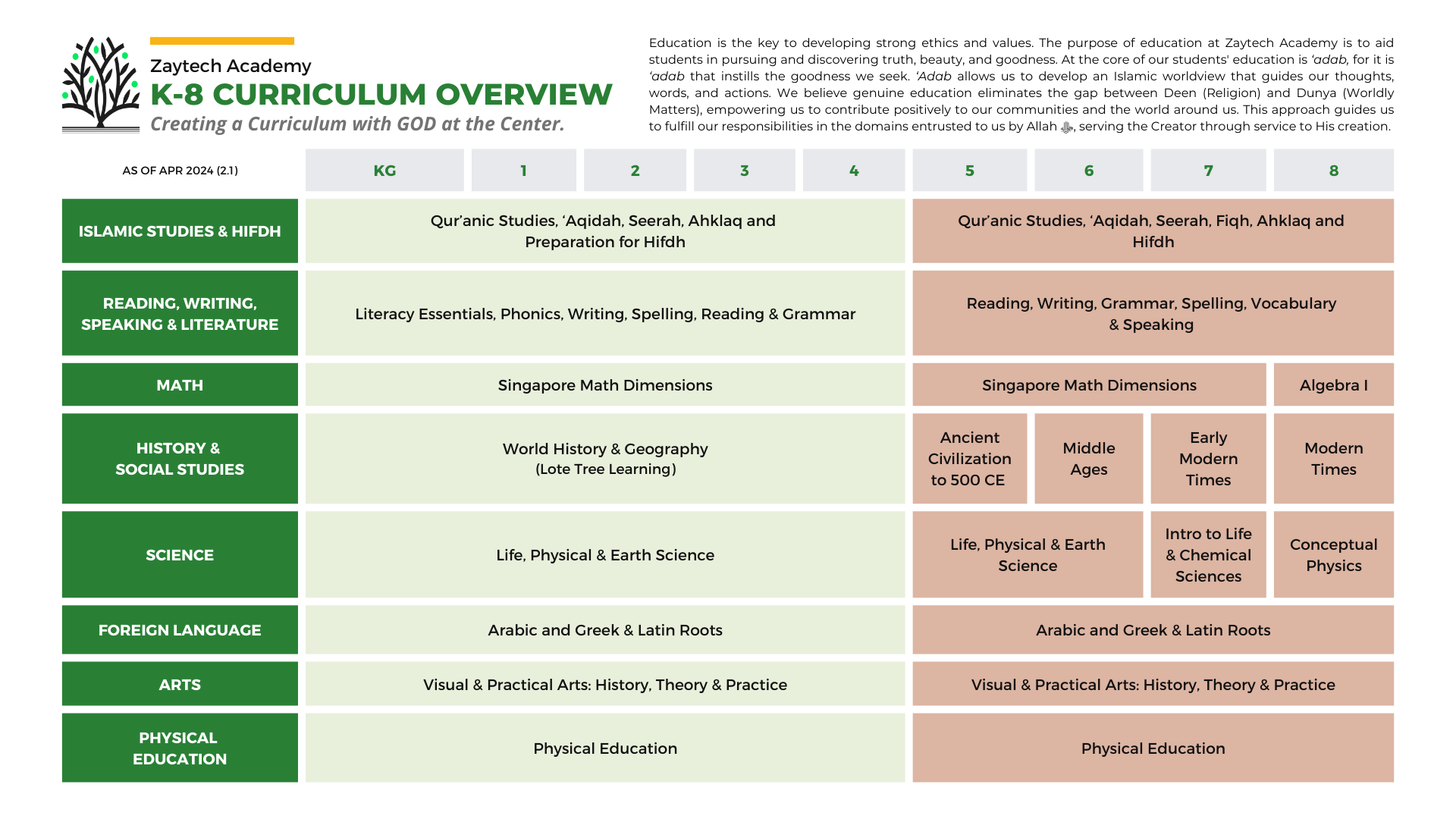 At Zaytech Academy, our history and social studies curriculum will follow a four-year cycle from grades 1 to 8. Students will delve into the Ancients, Middle Ages, Early Modern Times, and Modern Times twice during this period.  Aligned with the Tawhidic principle that emphasizes the interconnectedness of all knowledge and the Unity of Allah ﷻ, students will explore these historical eras with increasing depth as they progress from grades 1 to 8. Moreover, subjects such as math, science, language arts, Qur’an, and Seerah are integrated with history. This comprehensive approach is designed to offer students a well-rounded education that fosters a holistic worldview.